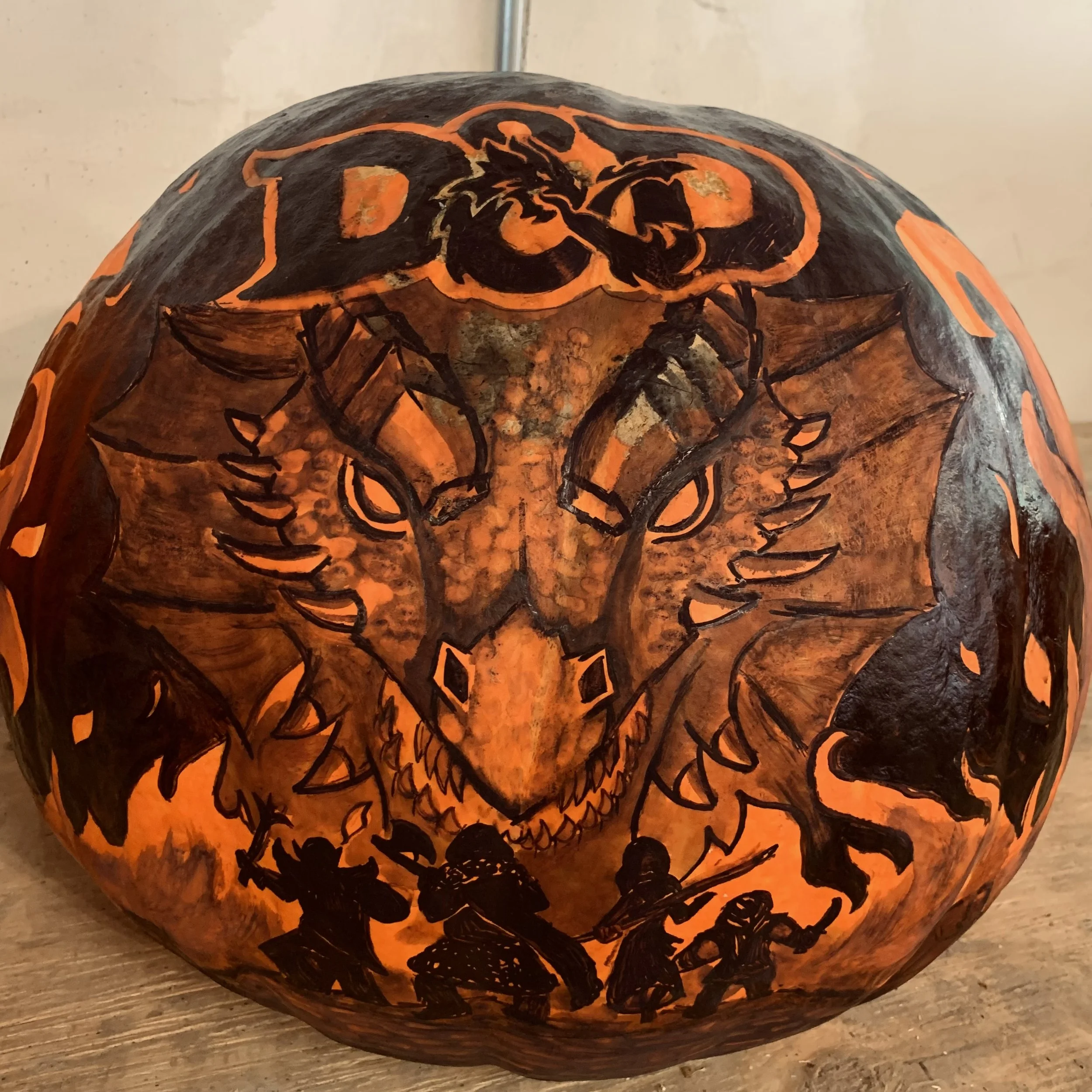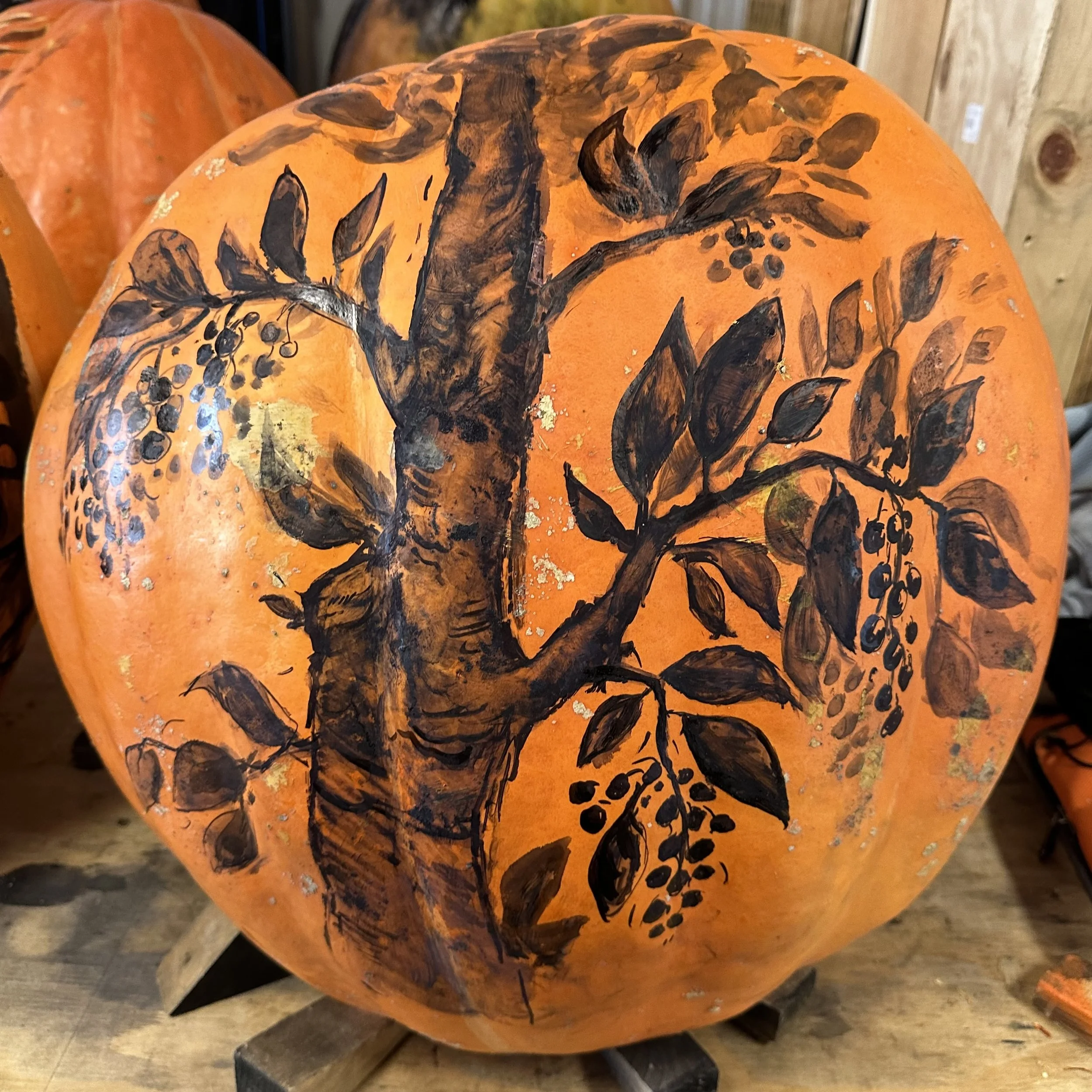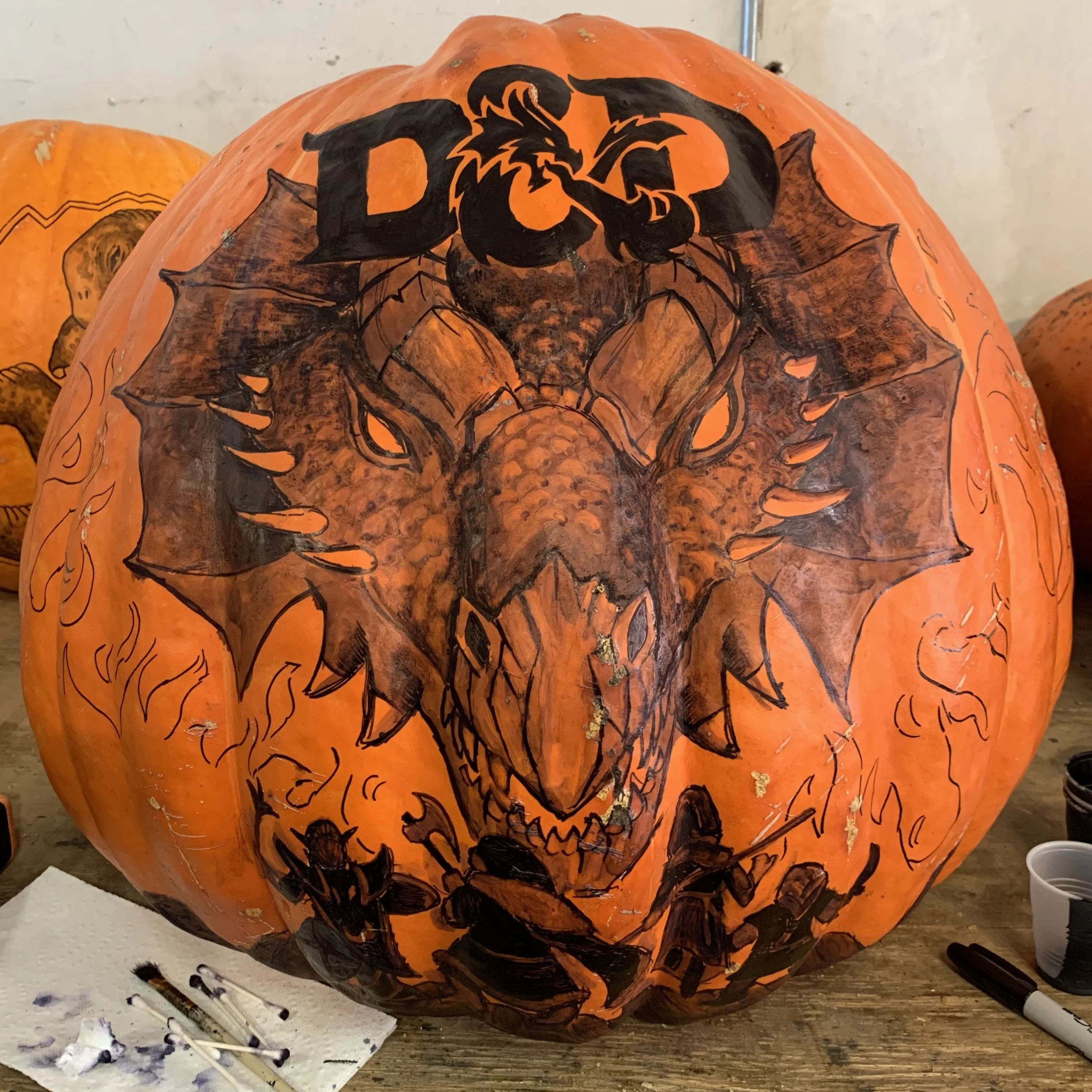 It is really hard to pick a favorite from this group — they were all a lot of fun to work on for different reasons! I like how the softer shading quality and almost painterly look came out on the Treasure Island pumpkin. The Mind Flayer pumpkin took a lot of precise detail work, and I really love how it looks lit up (sometimes the contrast in the lit pumpkin doesn’t quite live up to my hopes, and that was not the case this time!). Maleficent had a lot of crazy swirling details and I liked that composition a lot. KPop Demon Hunters was the “viral” pumpkin of this batch since the movie came out this year and has been super popular, and it’s always fun getting to do a pumpkin that can ride the hype wagon. The Wizard of Oz pumpkin (my last carve of the season) I was aiming for a “less is more” approach — normally I will either black out or back carve large background areas, but the whole sky and much of the yellow brick road was unadorned pumpkin skin. The studio manager gave me a great suggestion for how to handle the brick on the road without over-rendering it and I’m super pleased with how it turned out. It was also fun introducing a “spooky” setting and having the characters walking through a pumpkin patch with bare trees instead of the traditional poppy field.