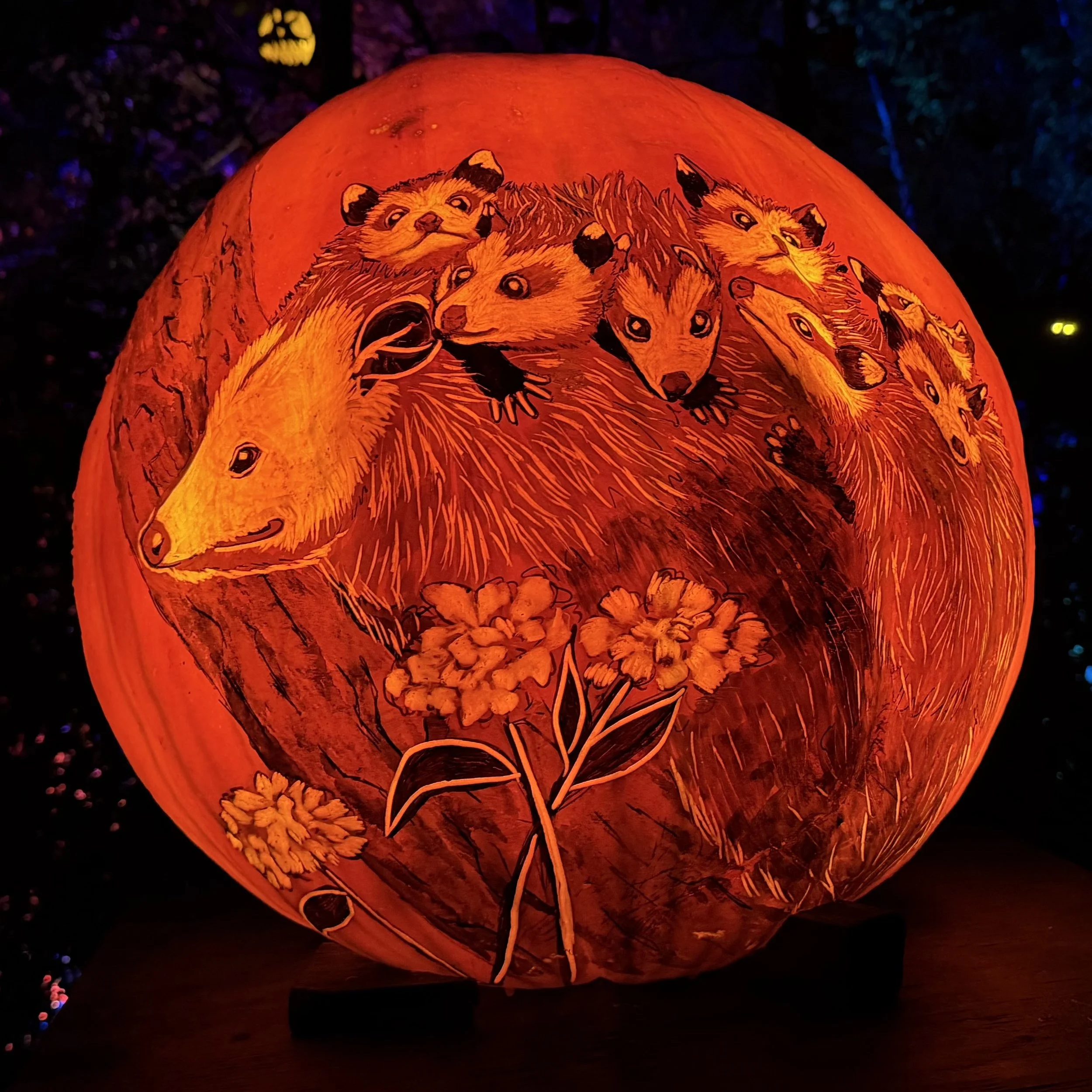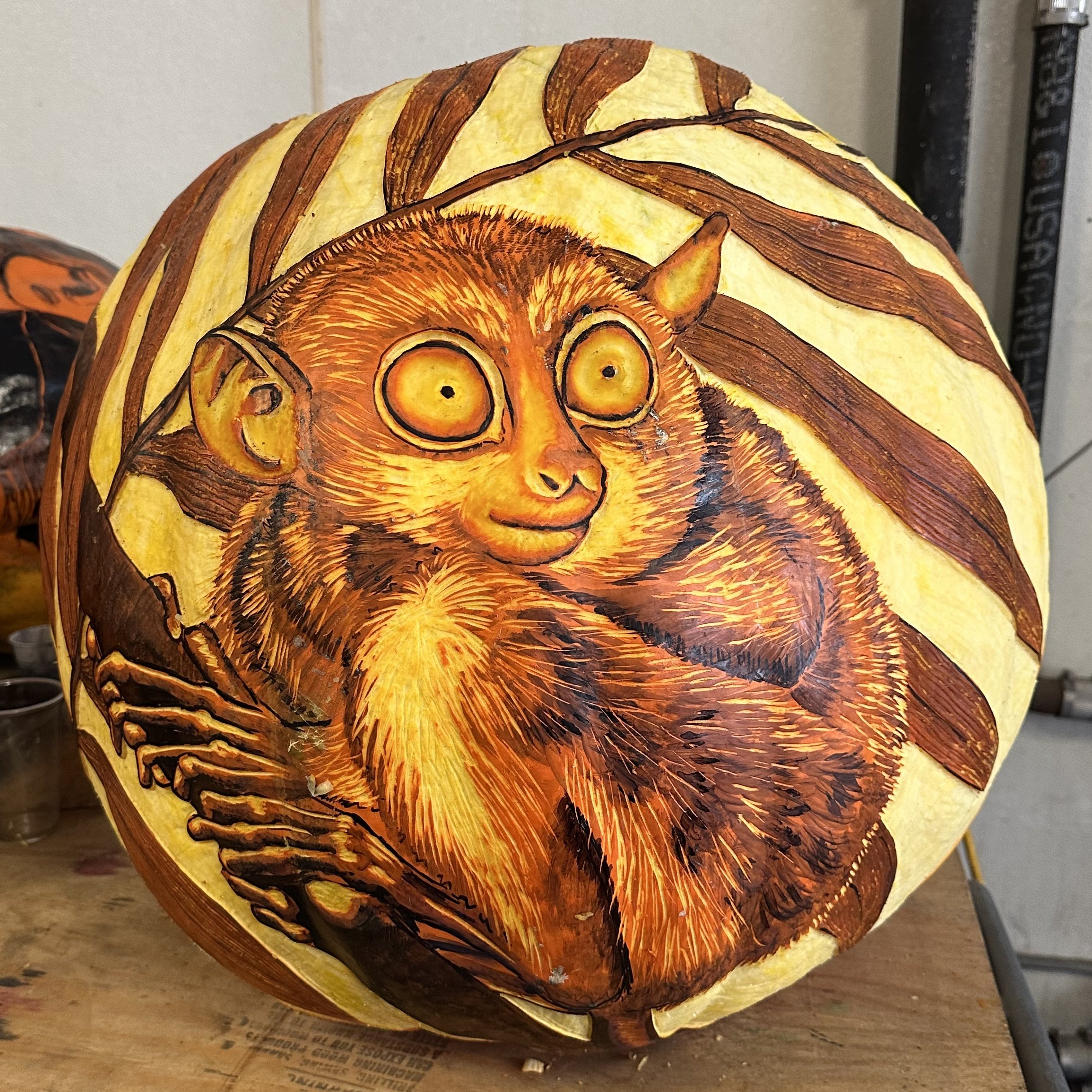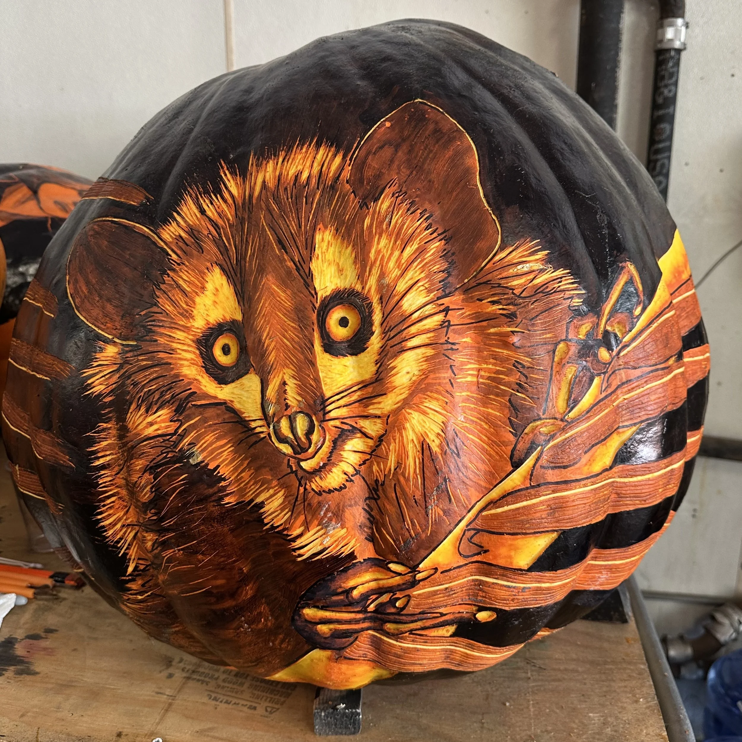 The animal jack-o-lanterns I did this year were all nocturnal animals, to go with the night theme. I had pretty good luck this year with getting photos of all the pumpkins lit, either in person or via another artist or the studio manager. The Aye-aye pumpkin was the only one I didn’t get to see in dark mode. The Amur Leopard is my favorite of this batch, really happy with how the eyes turned out. I did have a lot of fun with all the baby opossum faces as well.