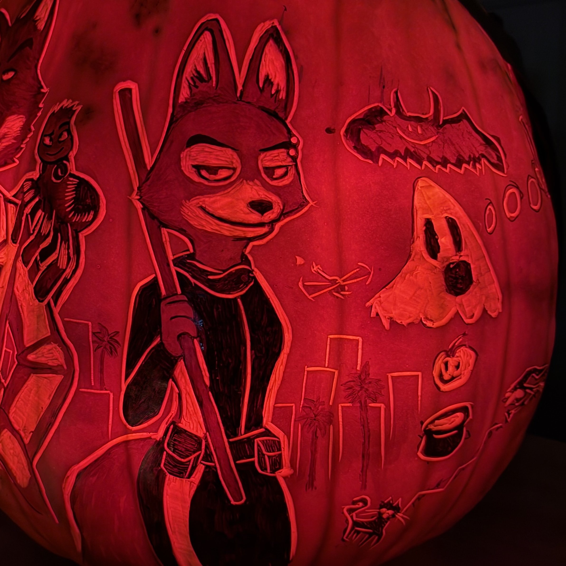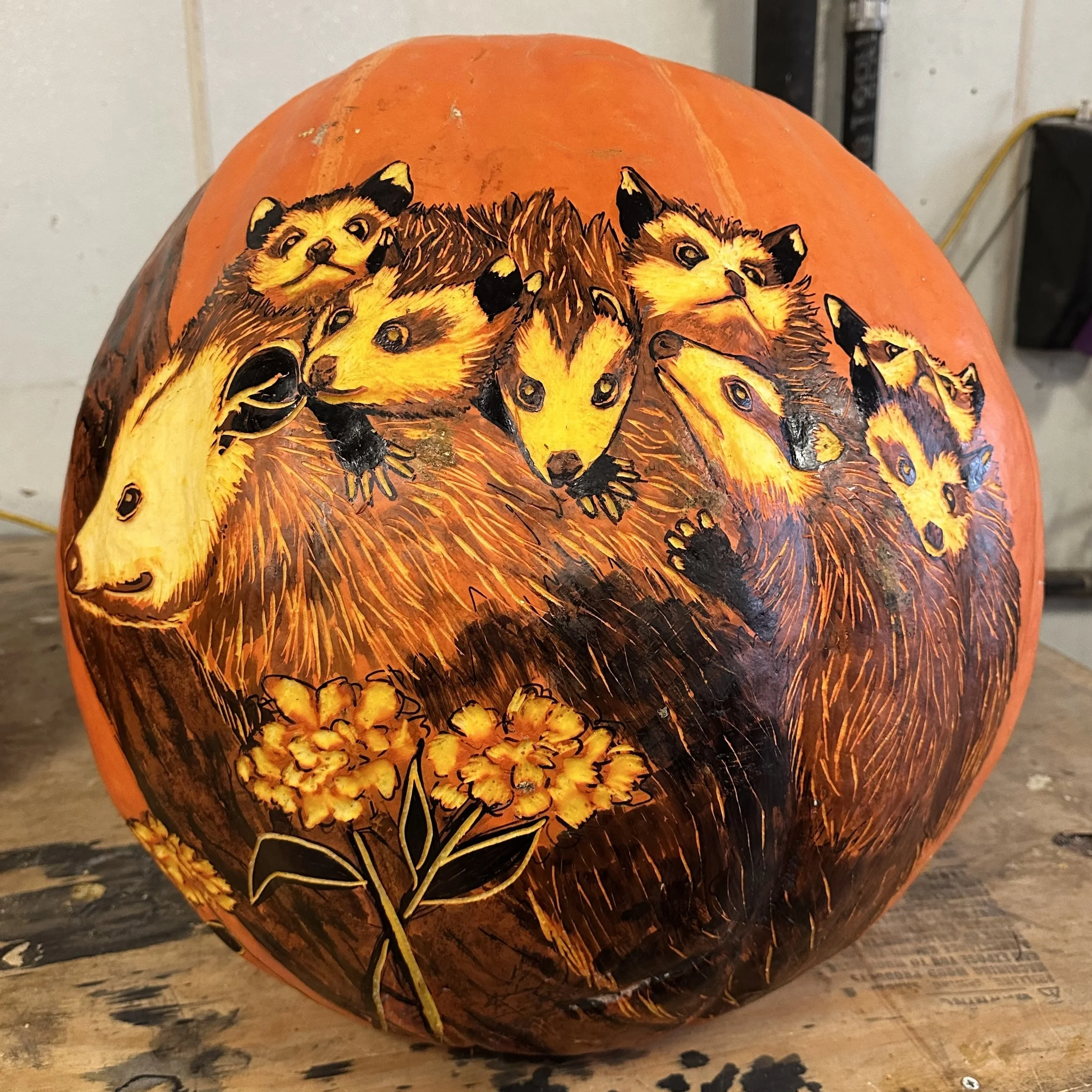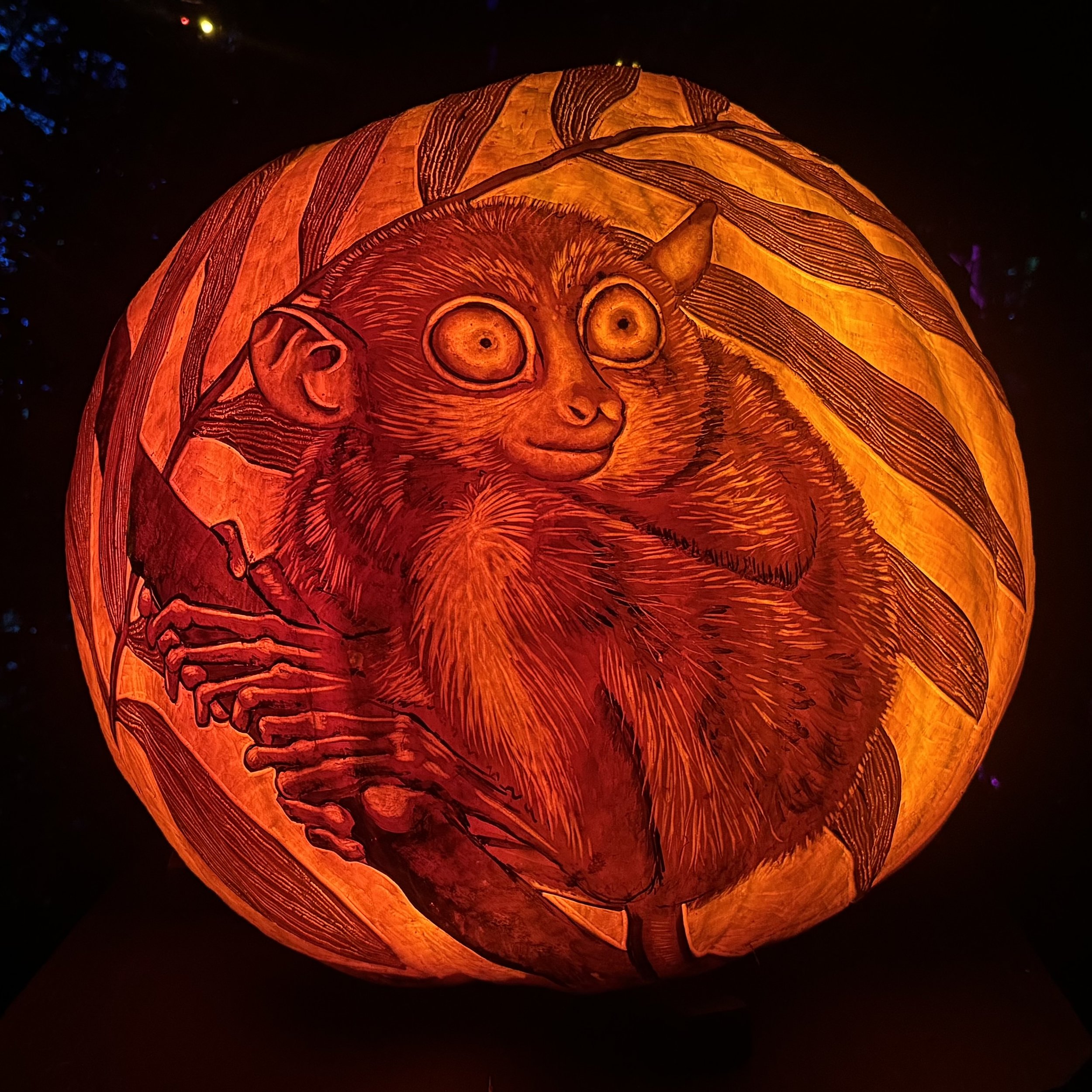 The animal jack-o-lanterns I did this year were all nocturnal animals, to go with the night theme. I had pretty good luck this year with getting photos of all the pumpkins lit, either in person or via another artist or the studio manager. The Aye-aye pumpkin was the only one I didn’t get to see in dark mode. The Amur Leopard is my favorite of this batch, really happy with how the eyes turned out. I did have a lot of fun with all the baby opossum faces as well.