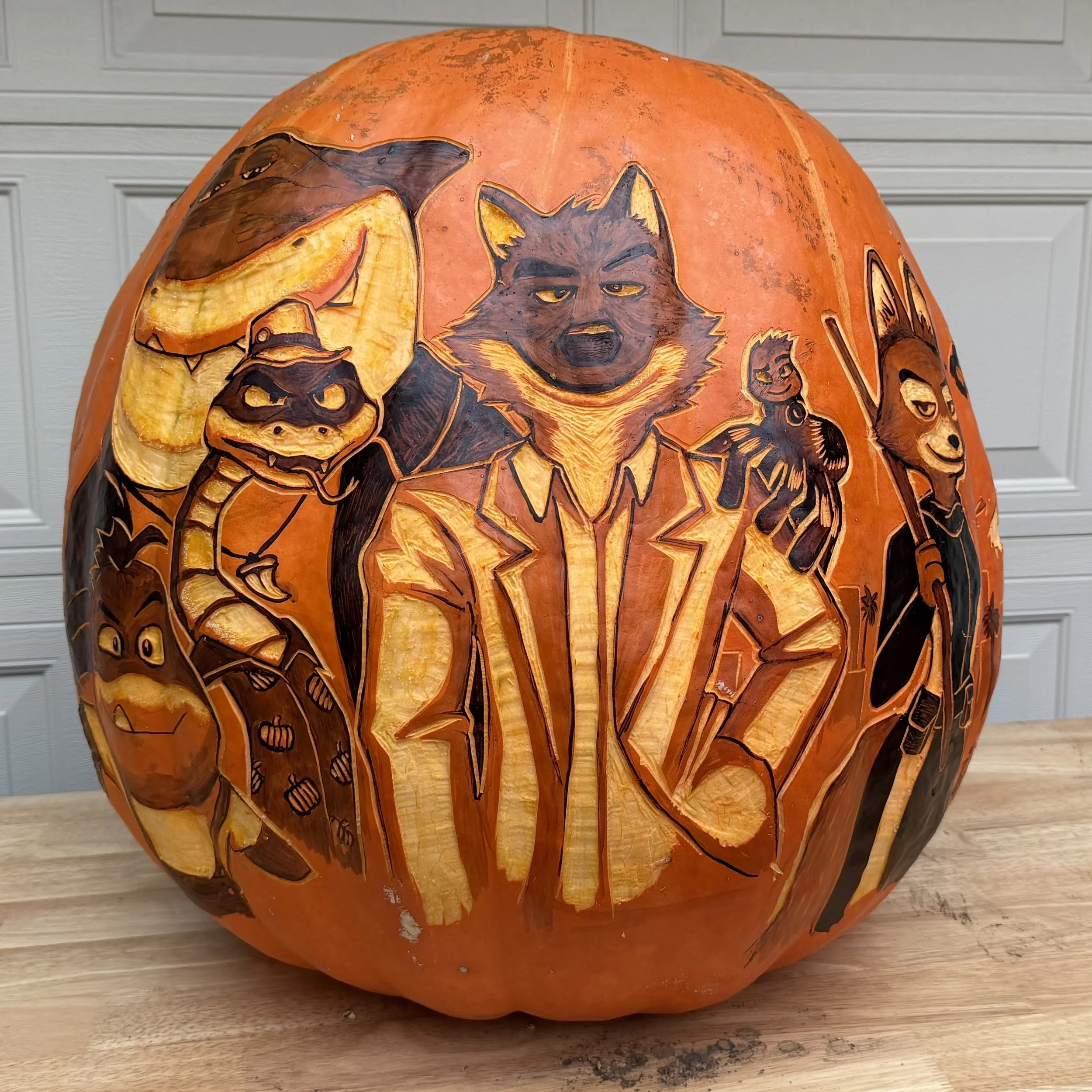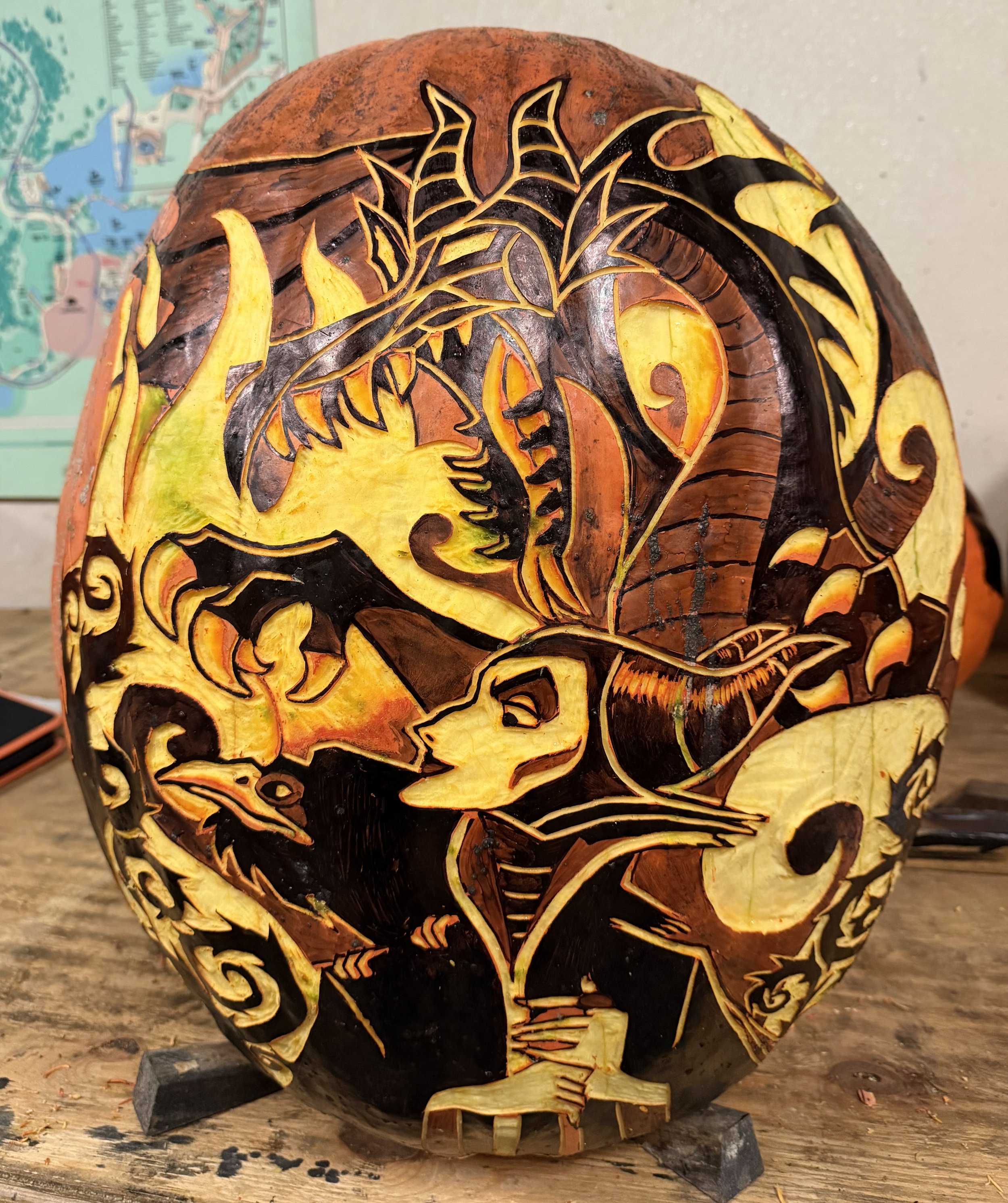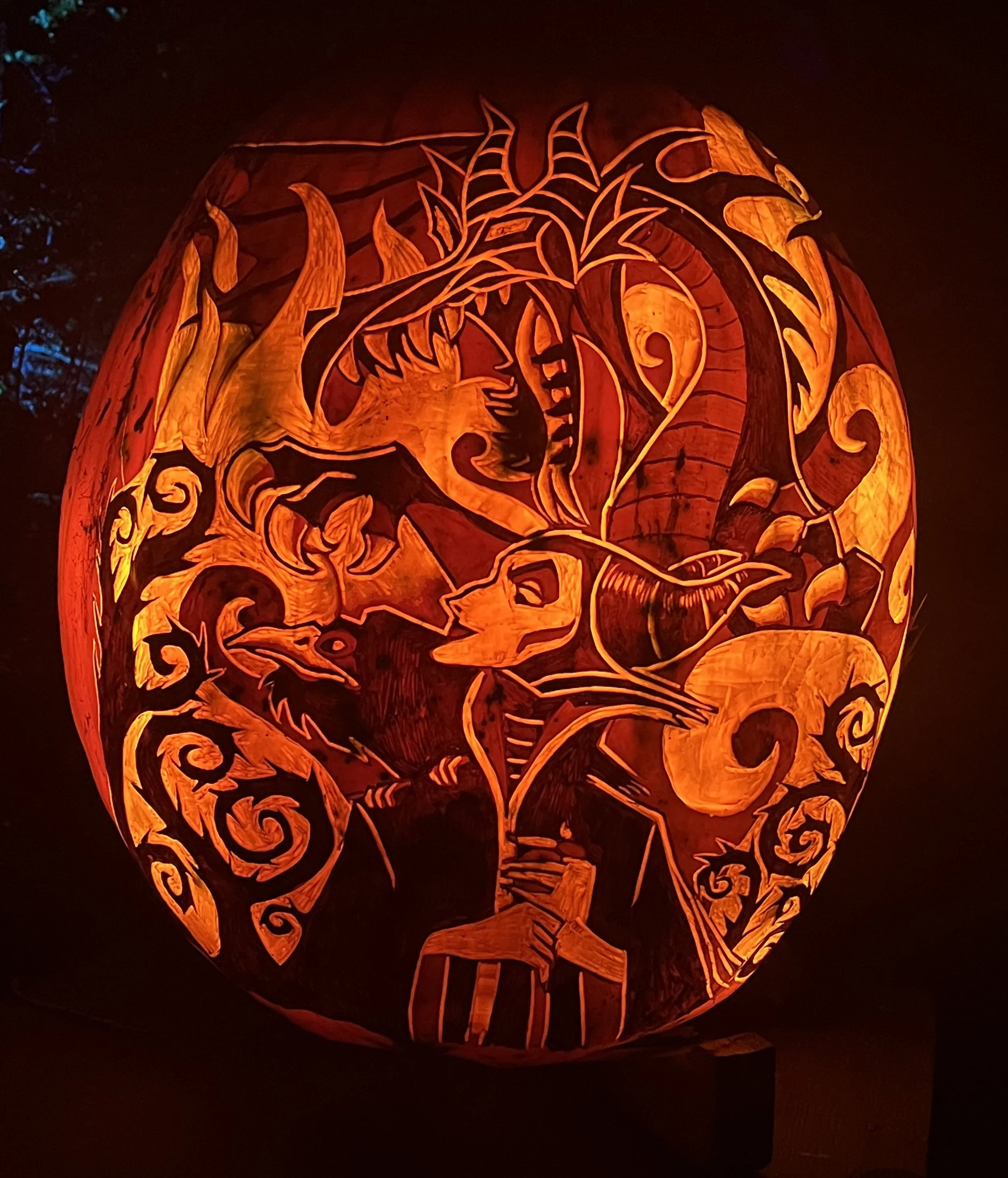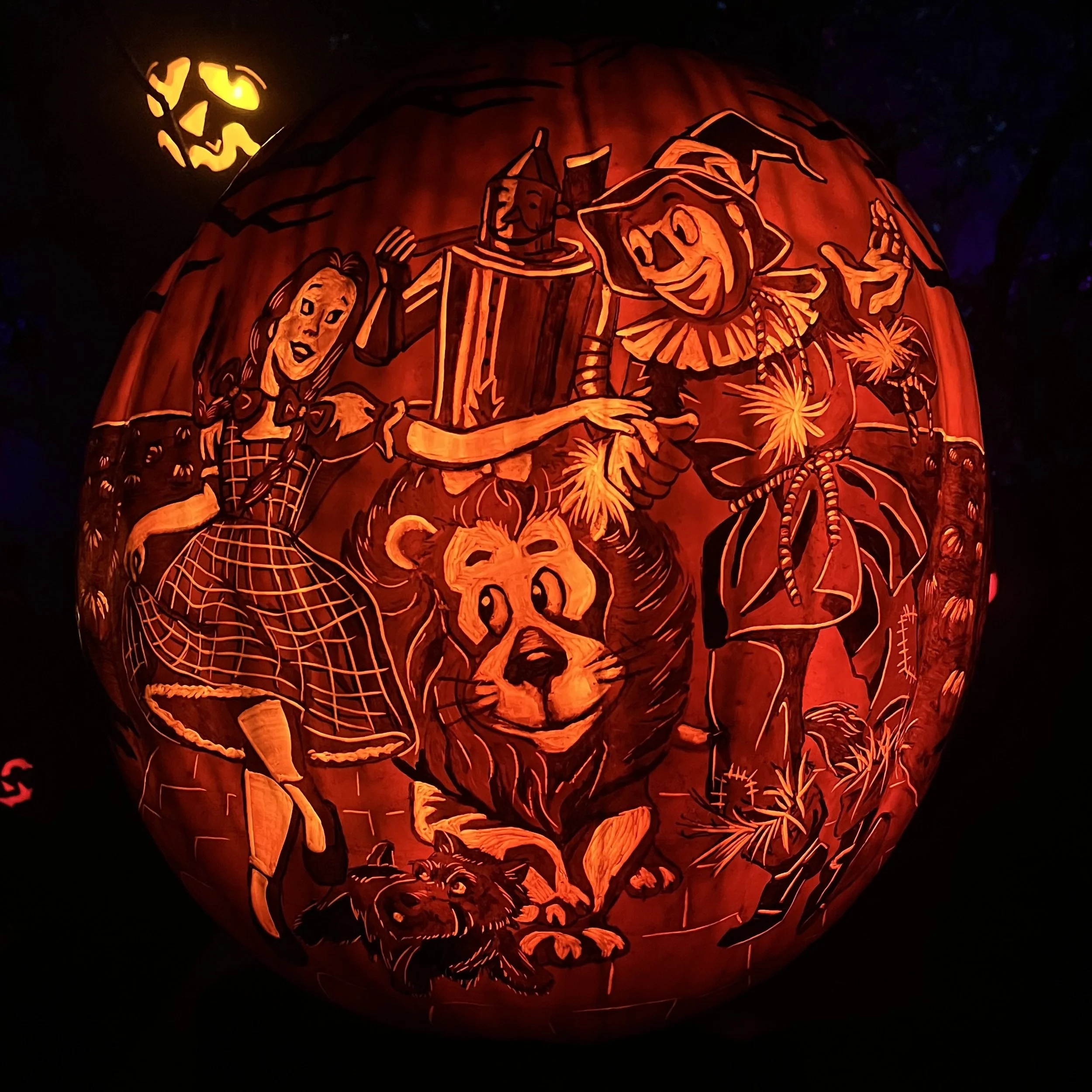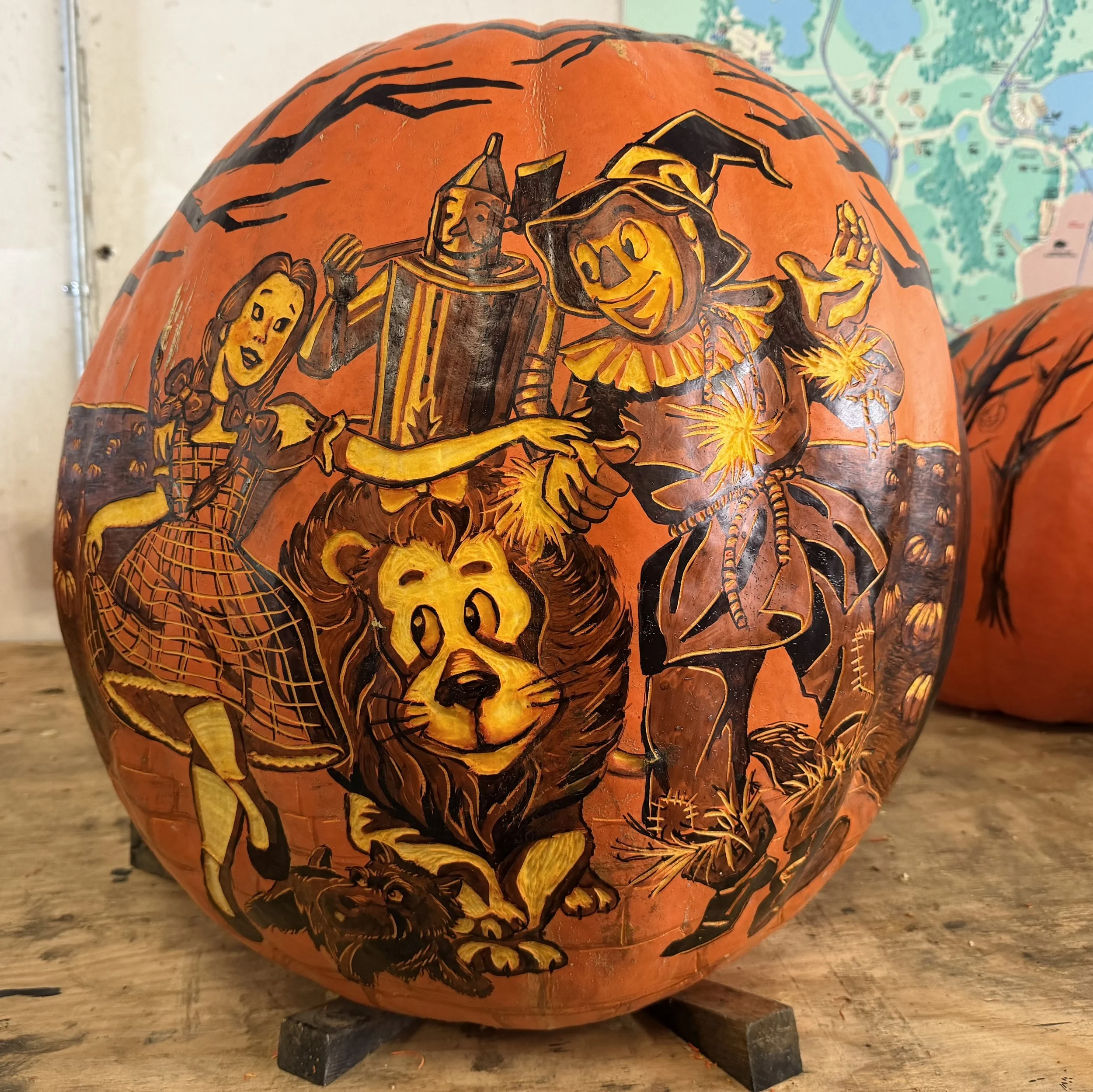 It is really hard to pick a favorite from this group — they were all a lot of fun to work on for different reasons! I like how the softer shading quality and almost painterly look came out on the Treasure Island pumpkin. The Mind Flayer pumpkin took a lot of precise detail work, and I really love how it looks lit up (sometimes the contrast in the lit pumpkin doesn’t quite live up to my hopes, and that was not the case this time!). Maleficent had a lot of crazy swirling details and I liked that composition a lot. KPop Demon Hunters was the “viral” pumpkin of this batch since the movie came out this year and has been super popular, and it’s always fun getting to do a pumpkin that can ride the hype wagon. The Wizard of Oz pumpkin (my last carve of the season) I was aiming for a “less is more” approach — normally I will either black out or back carve large background areas, but the whole sky and much of the yellow brick road was unadorned pumpkin skin. The studio manager gave me a great suggestion for how to handle the brick on the road without over-rendering it and I’m super pleased with how it turned out. It was also fun introducing a “spooky” setting and having the characters walking through a pumpkin patch with bare trees instead of the traditional poppy field.