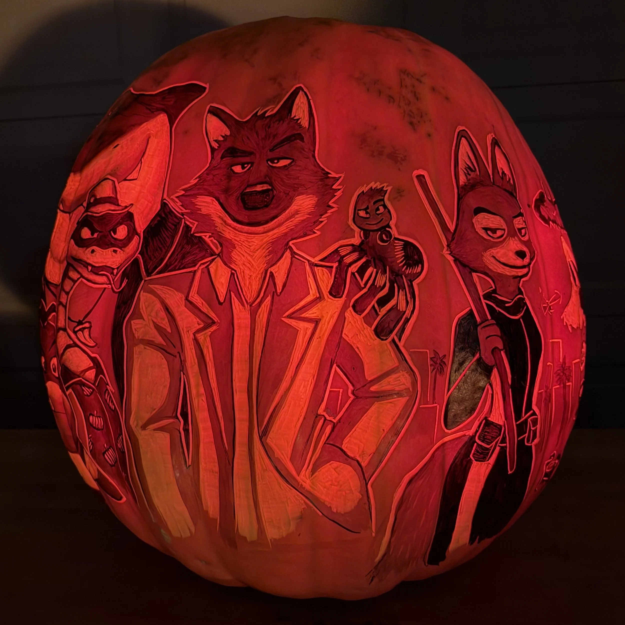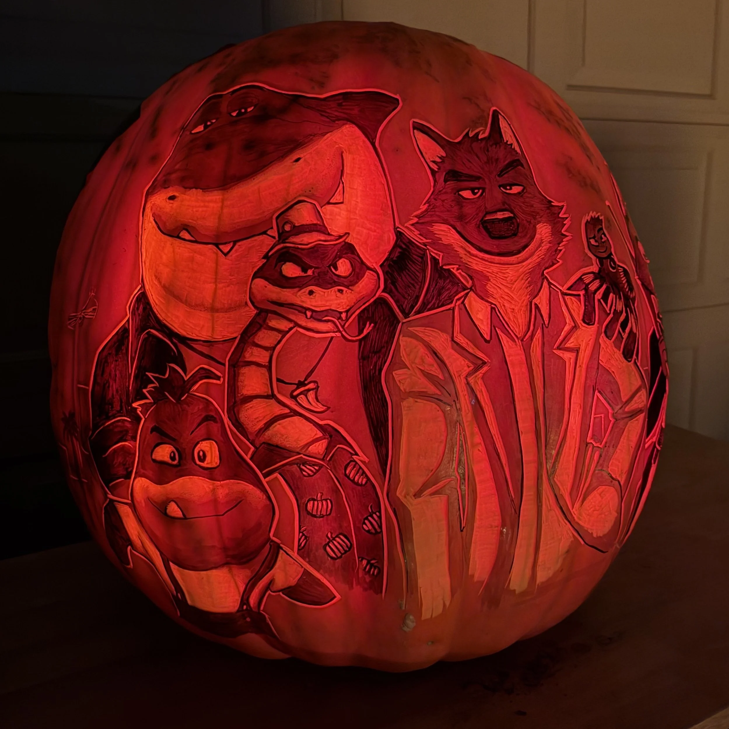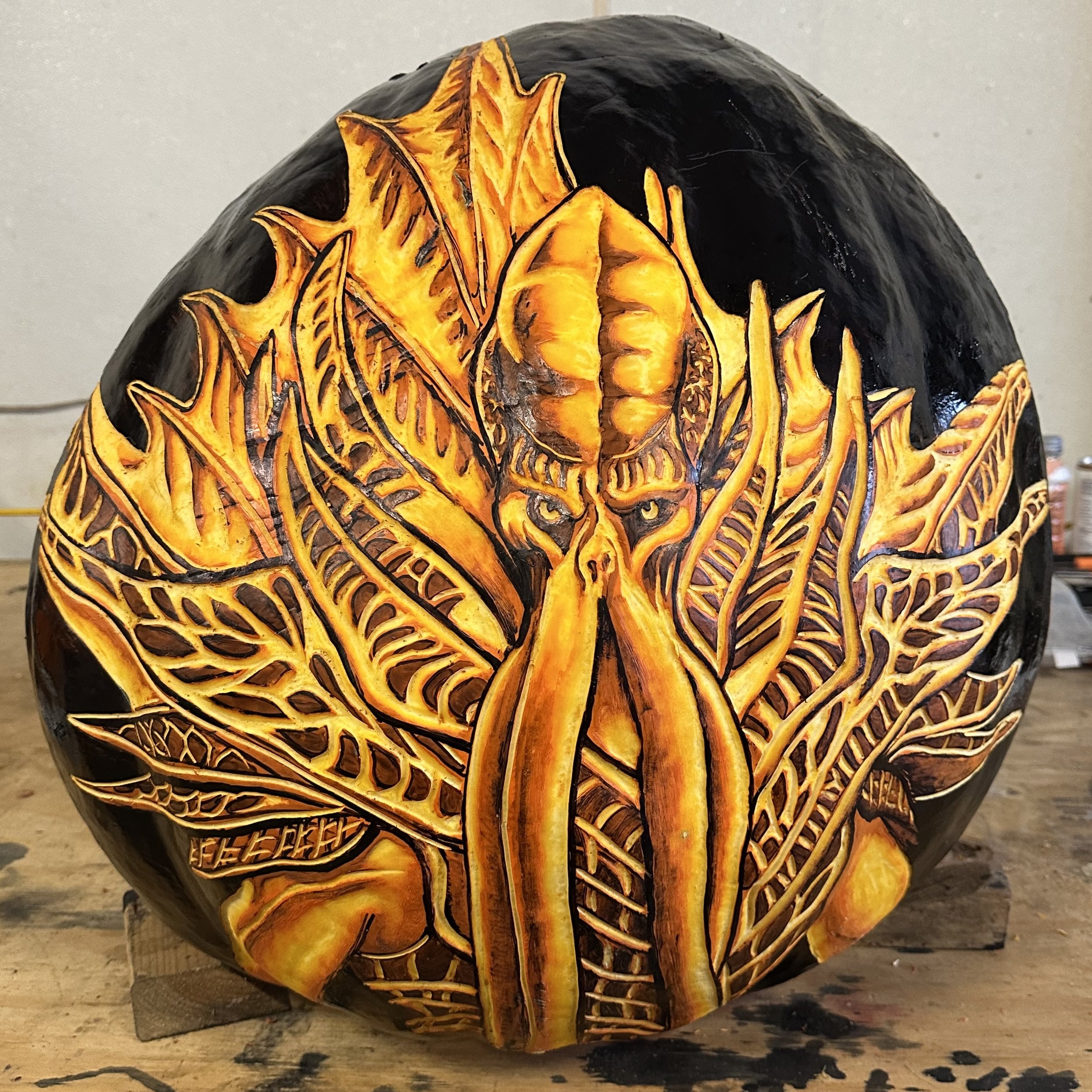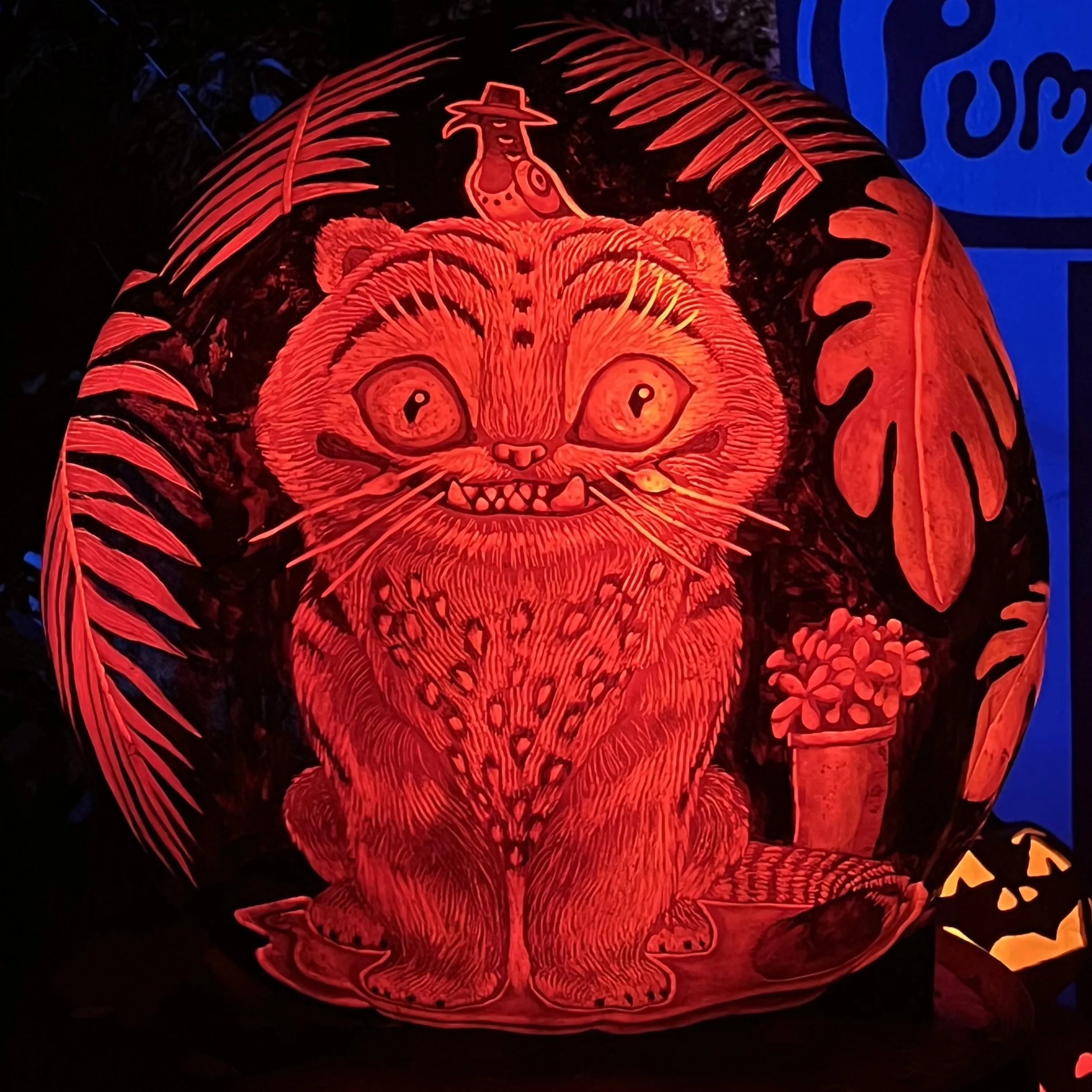 It is really hard to pick a favorite from this group — they were all a lot of fun to work on for different reasons! I like how the softer shading quality and almost painterly look came out on the Treasure Island pumpkin. The Mind Flayer pumpkin took a lot of precise detail work, and I really love how it looks lit up (sometimes the contrast in the lit pumpkin doesn’t quite live up to my hopes, and that was not the case this time!). Maleficent had a lot of crazy swirling details and I liked that composition a lot. KPop Demon Hunters was the “viral” pumpkin of this batch since the movie came out this year and has been super popular, and it’s always fun getting to do a pumpkin that can ride the hype wagon. The Wizard of Oz pumpkin (my last carve of the season) I was aiming for a “less is more” approach — normally I will either black out or back carve large background areas, but the whole sky and much of the yellow brick road was unadorned pumpkin skin. The studio manager gave me a great suggestion for how to handle the brick on the road without over-rendering it and I’m super pleased with how it turned out. It was also fun introducing a “spooky” setting and having the characters walking through a pumpkin patch with bare trees instead of the traditional poppy field.