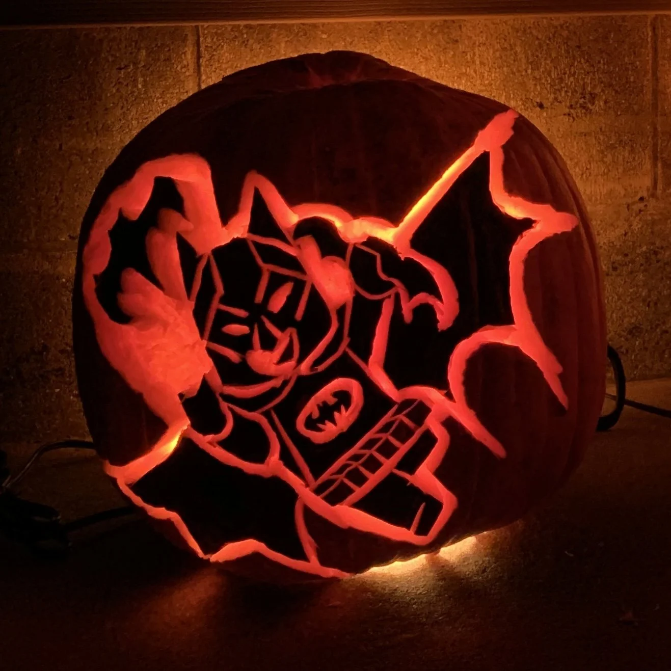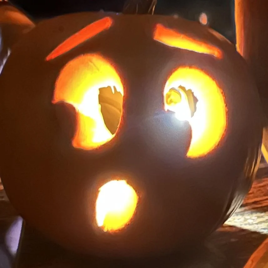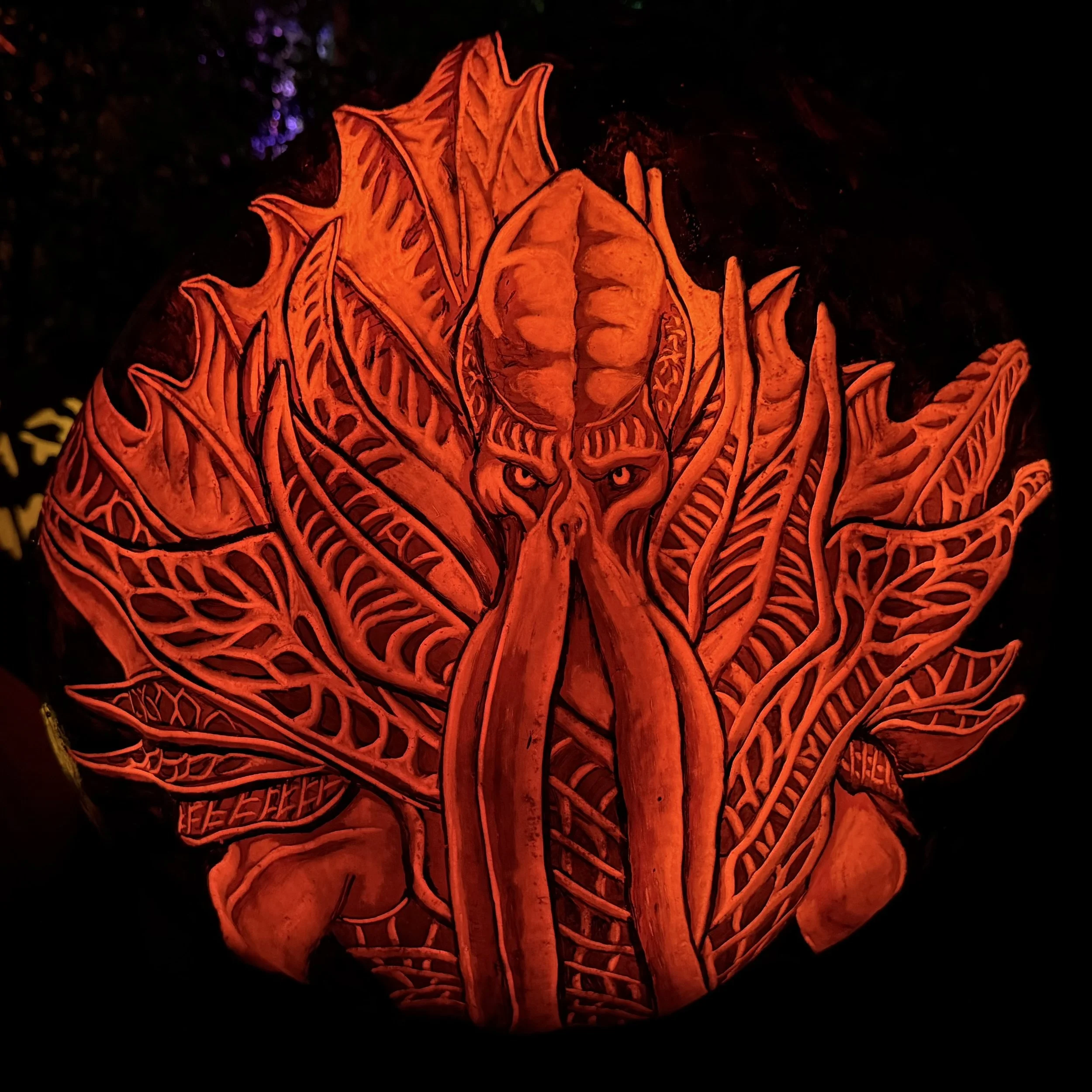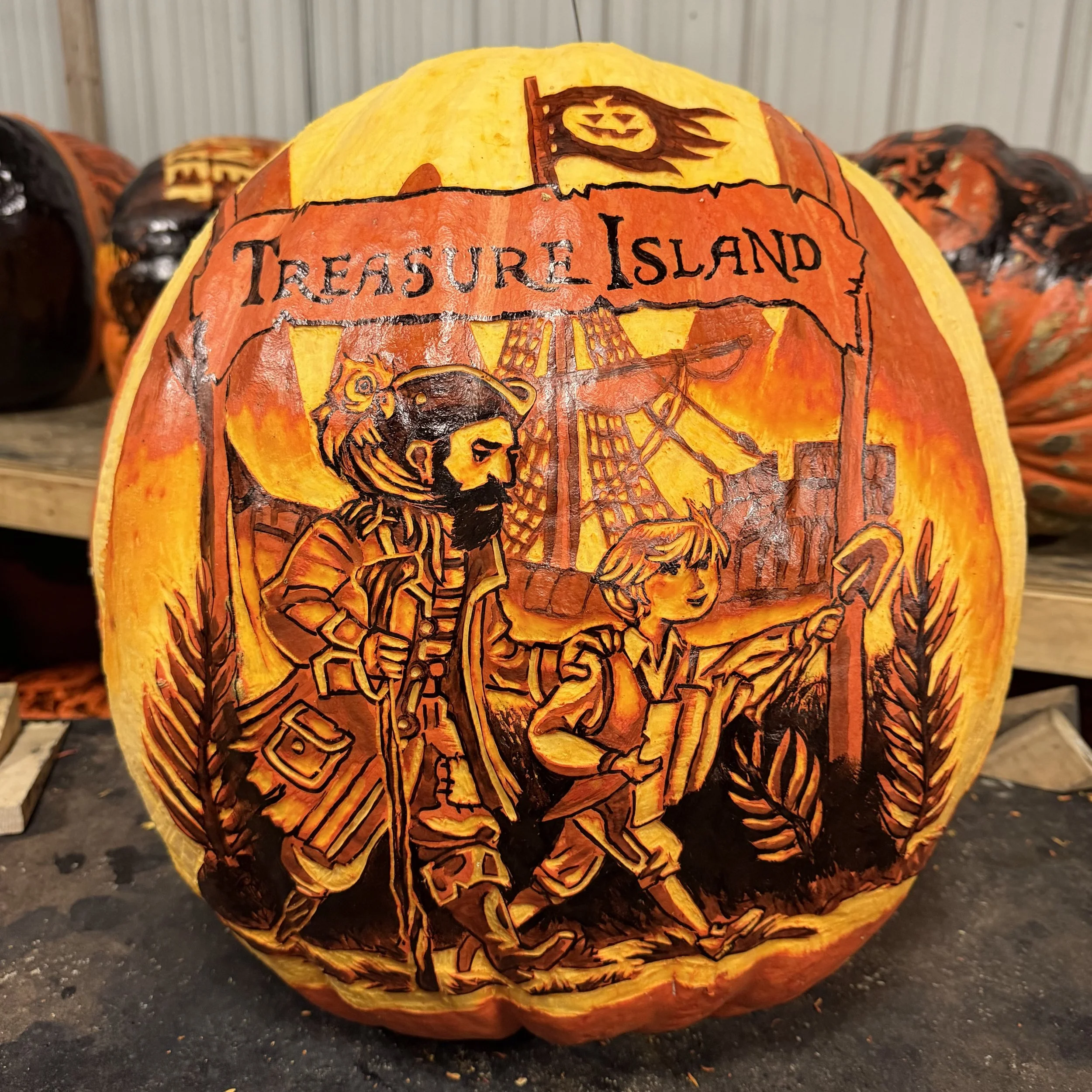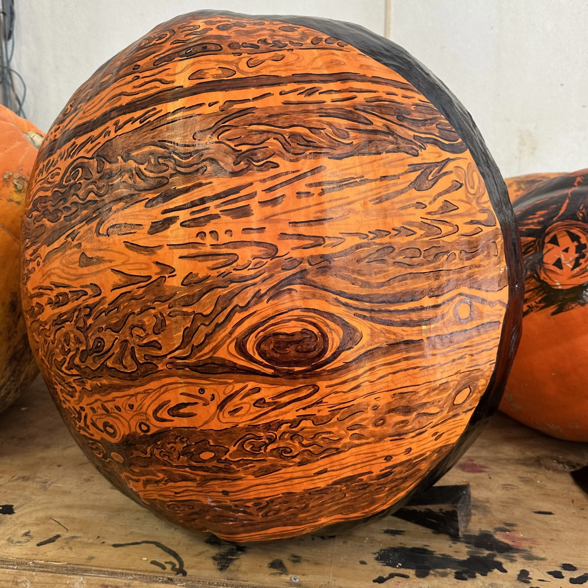 It is really hard to pick a favorite from this group — they were all a lot of fun to work on for different reasons! I like how the softer shading quality and almost painterly look came out on the Treasure Island pumpkin. The Mind Flayer pumpkin took a lot of precise detail work, and I really love how it looks lit up (sometimes the contrast in the lit pumpkin doesn’t quite live up to my hopes, and that was not the case this time!). Maleficent had a lot of crazy swirling details and I liked that composition a lot. KPop Demon Hunters was the “viral” pumpkin of this batch since the movie came out this year and has been super popular, and it’s always fun getting to do a pumpkin that can ride the hype wagon. The Wizard of Oz pumpkin (my last carve of the season) I was aiming for a “less is more” approach — normally I will either black out or back carve large background areas, but the whole sky and much of the yellow brick road was unadorned pumpkin skin. The studio manager gave me a great suggestion for how to handle the brick on the road without over-rendering it and I’m super pleased with how it turned out. It was also fun introducing a “spooky” setting and having the characters walking through a pumpkin patch with bare trees instead of the traditional poppy field.