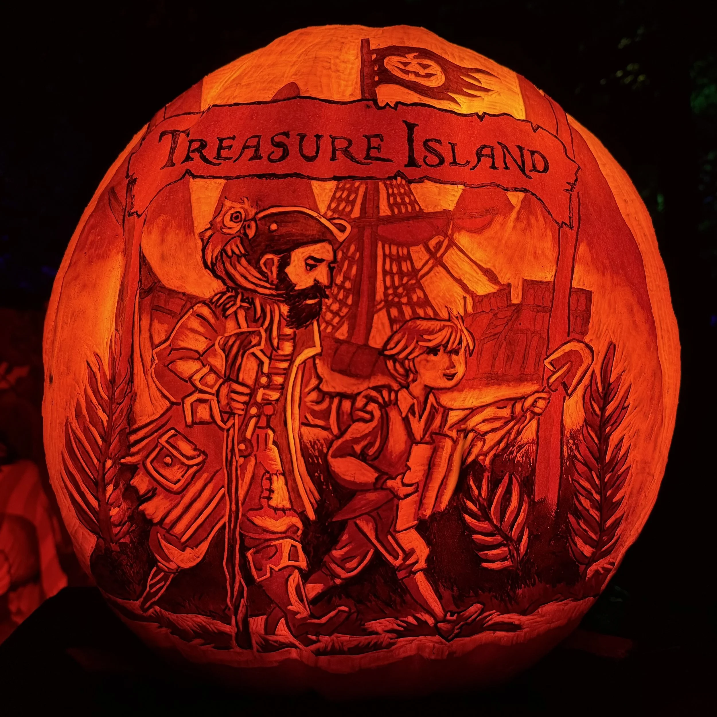 After the first round of pumpkins, it is also allowed (and encouraged) to come up with “off-book” subjects for pumpkins. Each skit starts with pre-determined subjects for each pumpkin, and there’s usually a few key subjects that are always supposed to be represented, but allowing artists to branch out and bring their own ideas to the table keeps the show feeling fresh and the artists inspired to do their best work. It’s also beneficial to have unique subjects to put out on the trail without having to worry about what pumpkins they will be next to. For example, I drew my Wizard of Oz pumpkin September 27th but didn’t get to carve it till October 19th, because there was already an earlier Wizard of Oz pumpkin on the trail that was going strong — in contrast, the Treasure Island and Maleficent pumpkins were both draw/carves (pumpkins that are drawn and carved without an extended gap between the stages) that I picked off-book subjects for, and these were able to be placed on the trail as early as next day to replace any tired pumpkin in their respective skits.