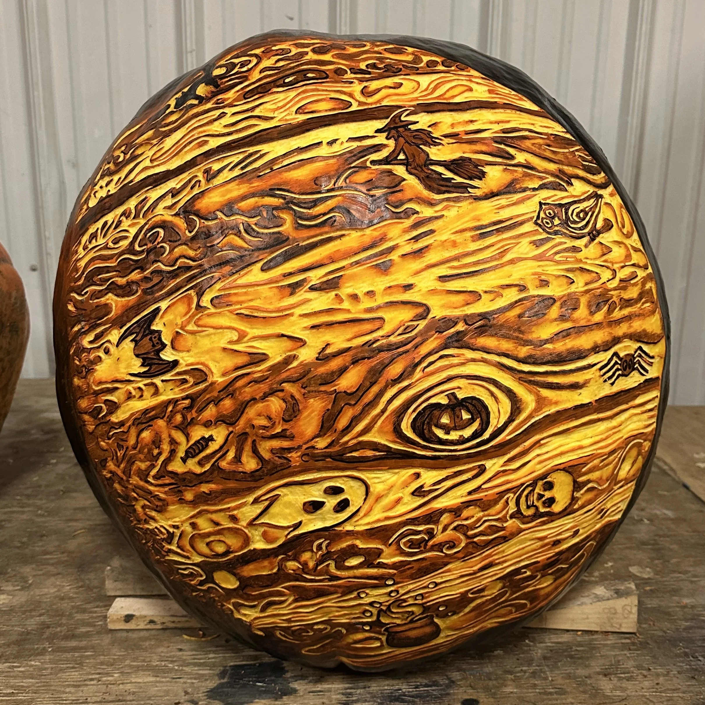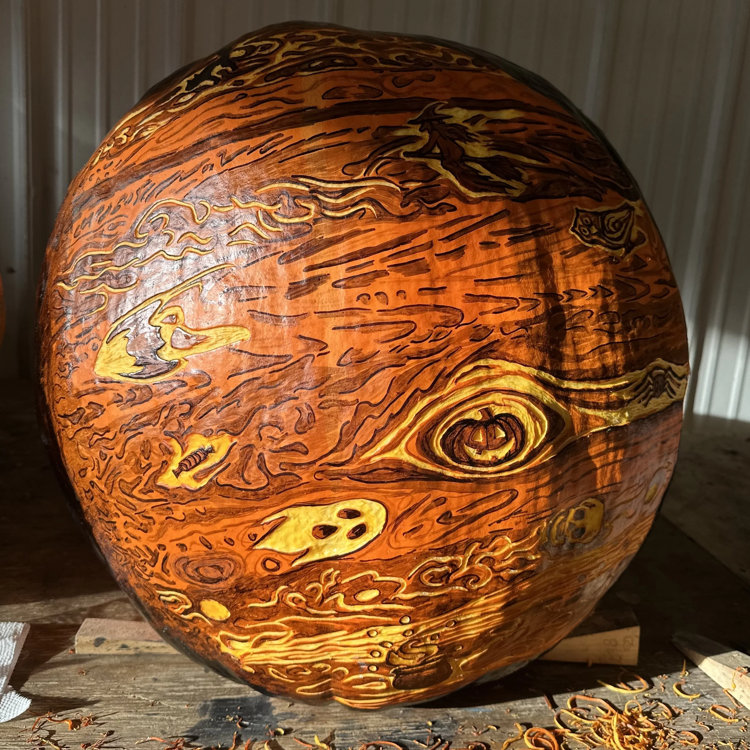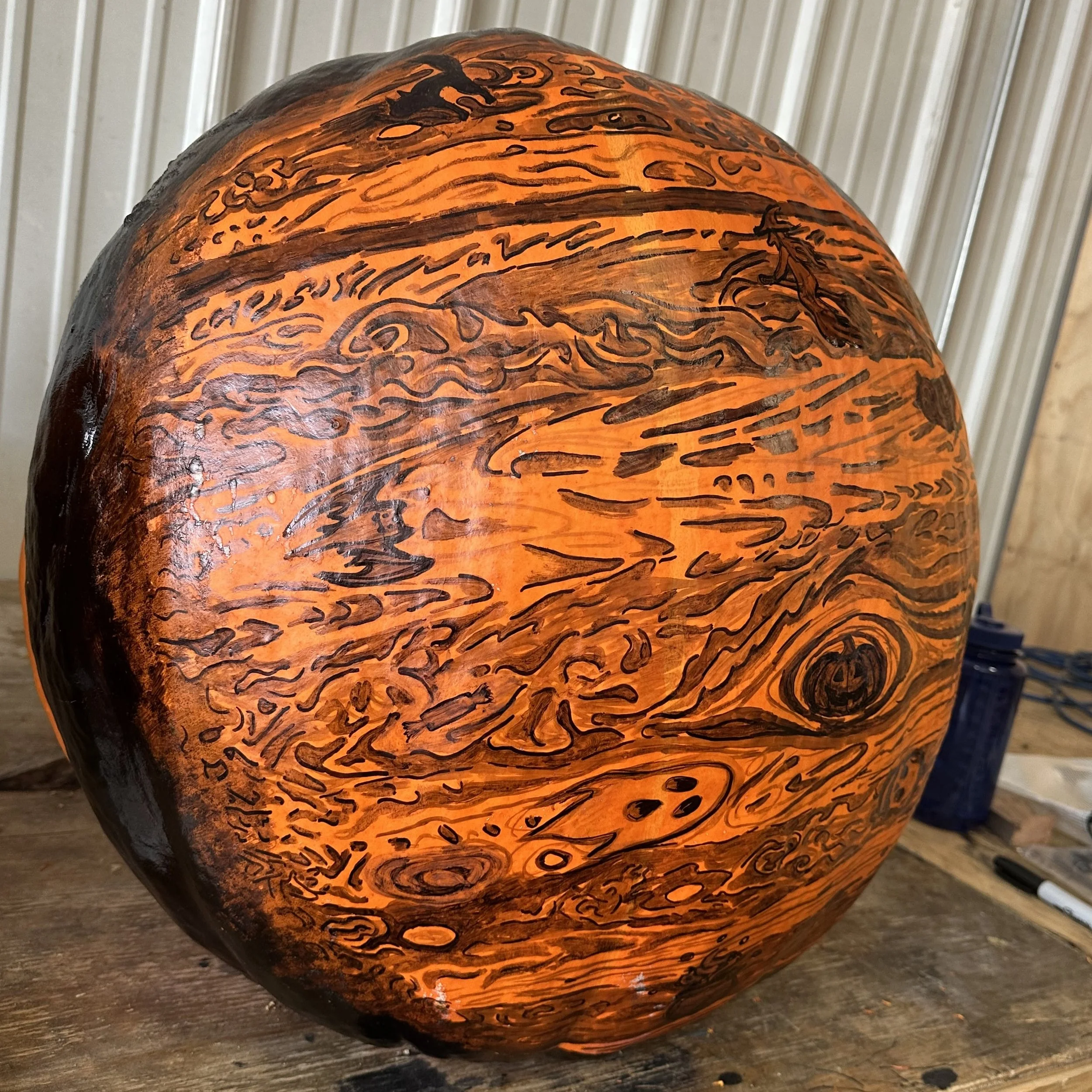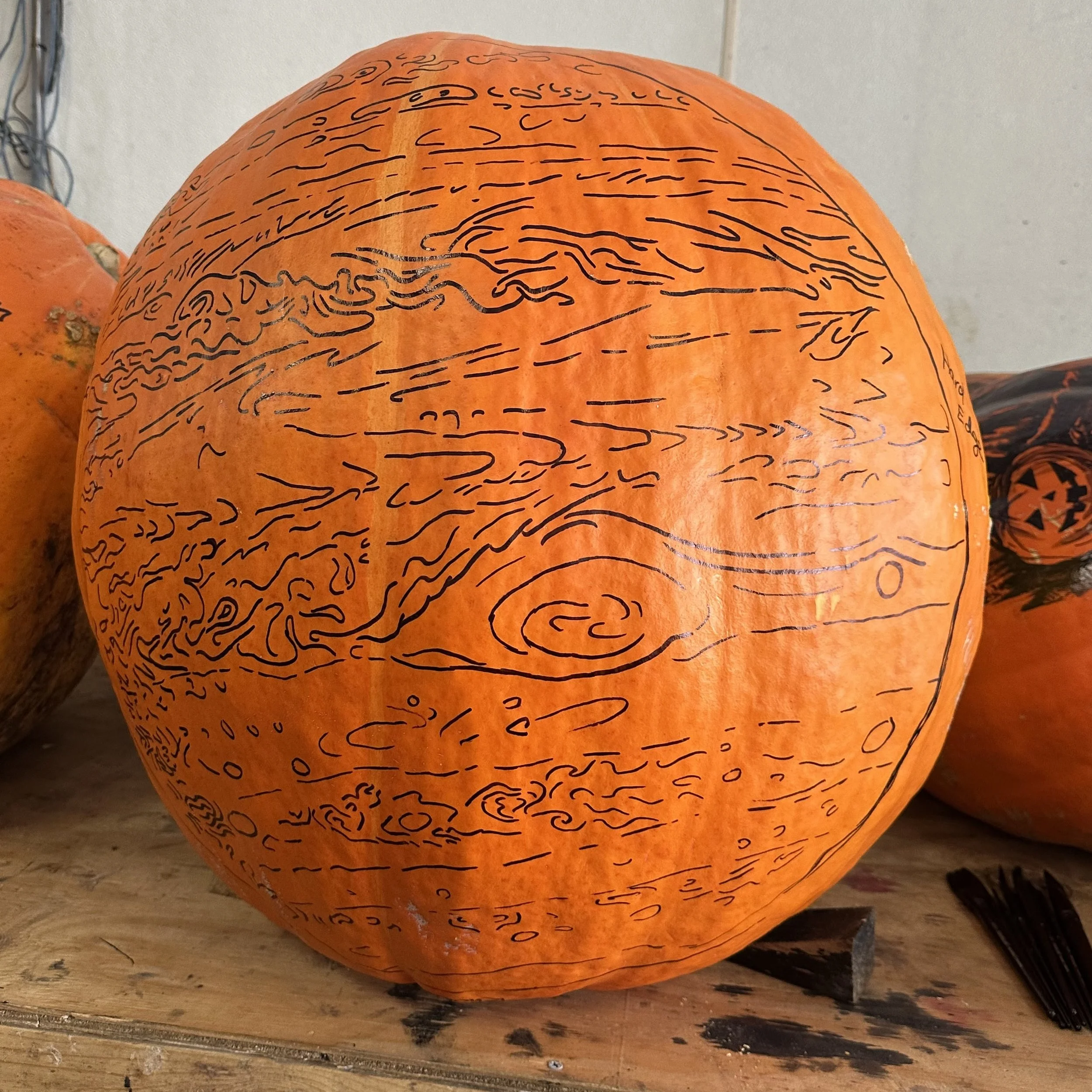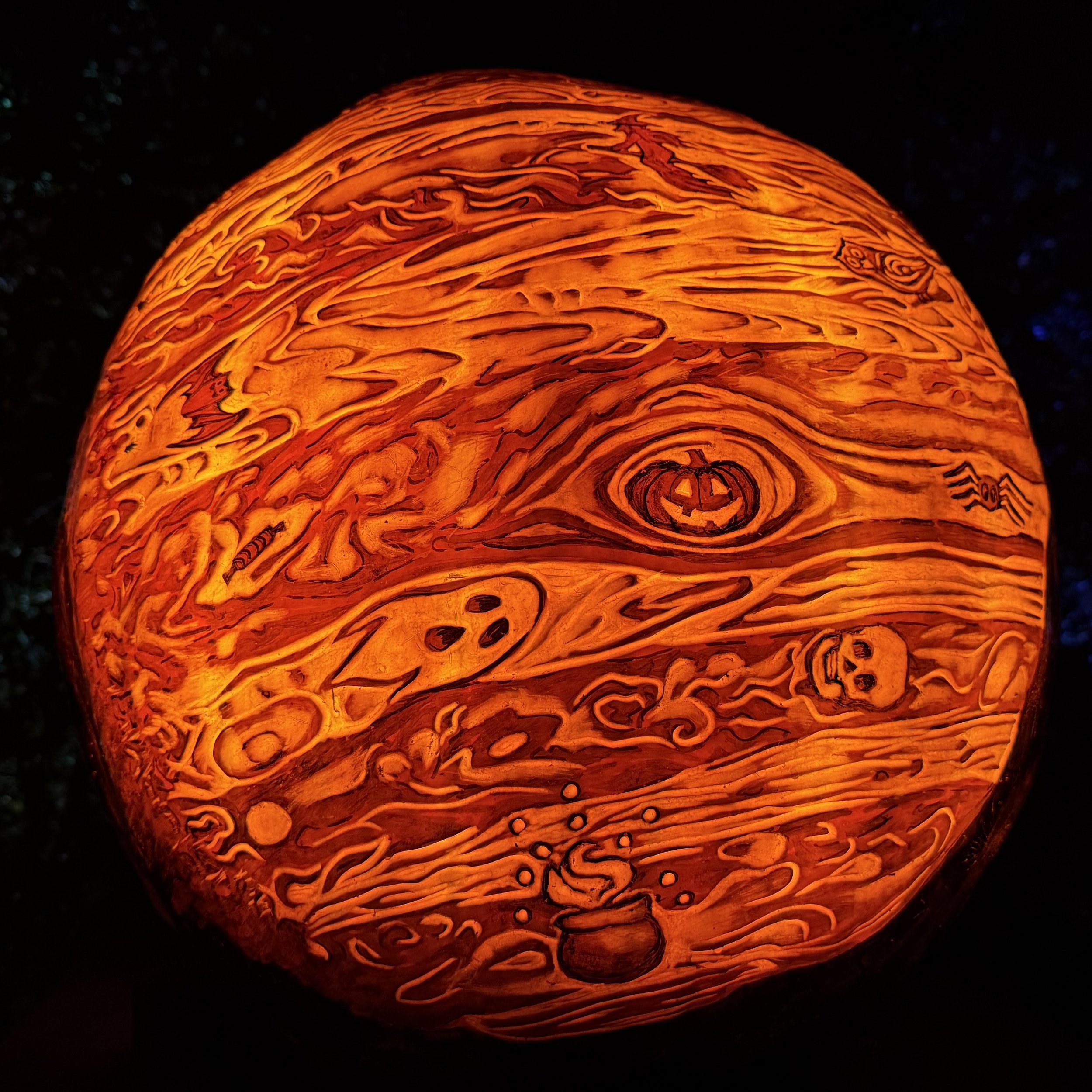 The original plan was to do a straight up Jupiter pumpkin, but one of the other artists suggested that I could hide some subtle spooky images among the swirls. So of course I had to do that now! Even though the drawing portion of the jack-o-lantern creation process is done in permanent alcohol-based ink to avoid rain washing the design away, it’s easy to make changes using isopropyl alcohol and paper towel or q-tips to erase. I added ten halloween-themed spooky secrets and turned it into a Jupiter Seek-And-Find pumpkin. Can you find them all?