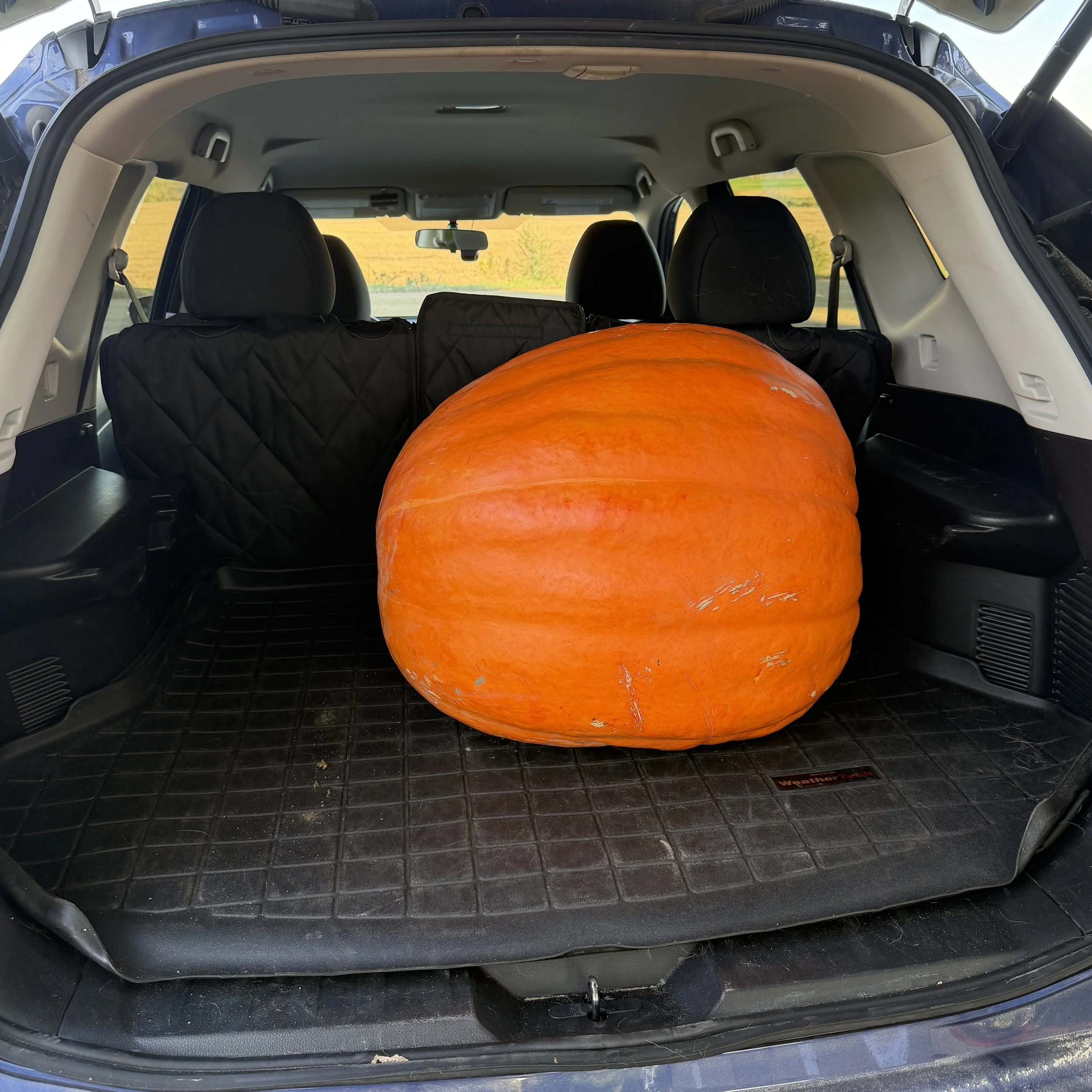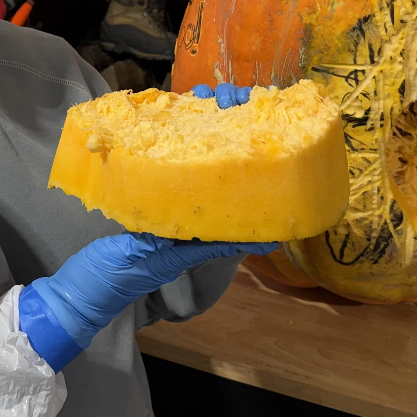 For the first time ever, I bought one of the same type of pumpkin used at the show for our home jack-o-lantern (if you’re local in Minnesota, check out Crazy Legs Farm & Pumpkins). I called ahead and let them know I was an artist at the pumpkin show at the zoo, and asked if they could pick out a good pumpkin for me to purchase and carve at home. When I showed up, the farmer had the pumpkin on a pallet and used a forklift to get it level with the bed of my vehicle and then rolled it in. I was a bit nervous about getting the pumpkin back out of the car once I got home, but thankfully my husband was able to wrangle it onto the workbench without breaking his back.