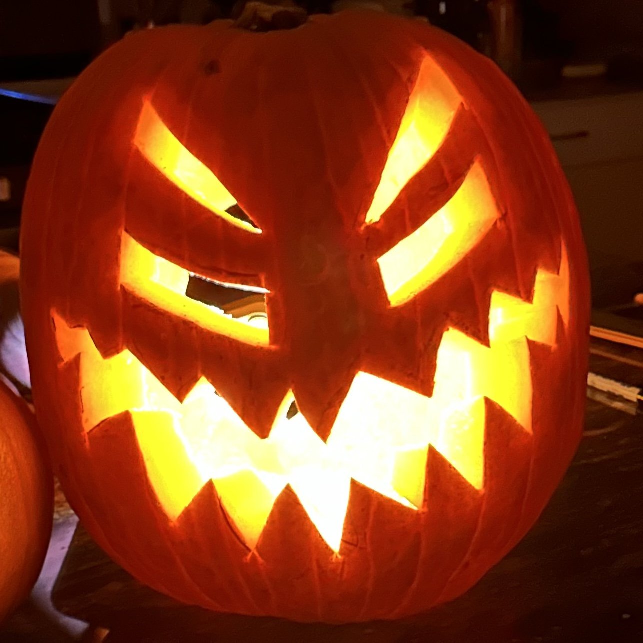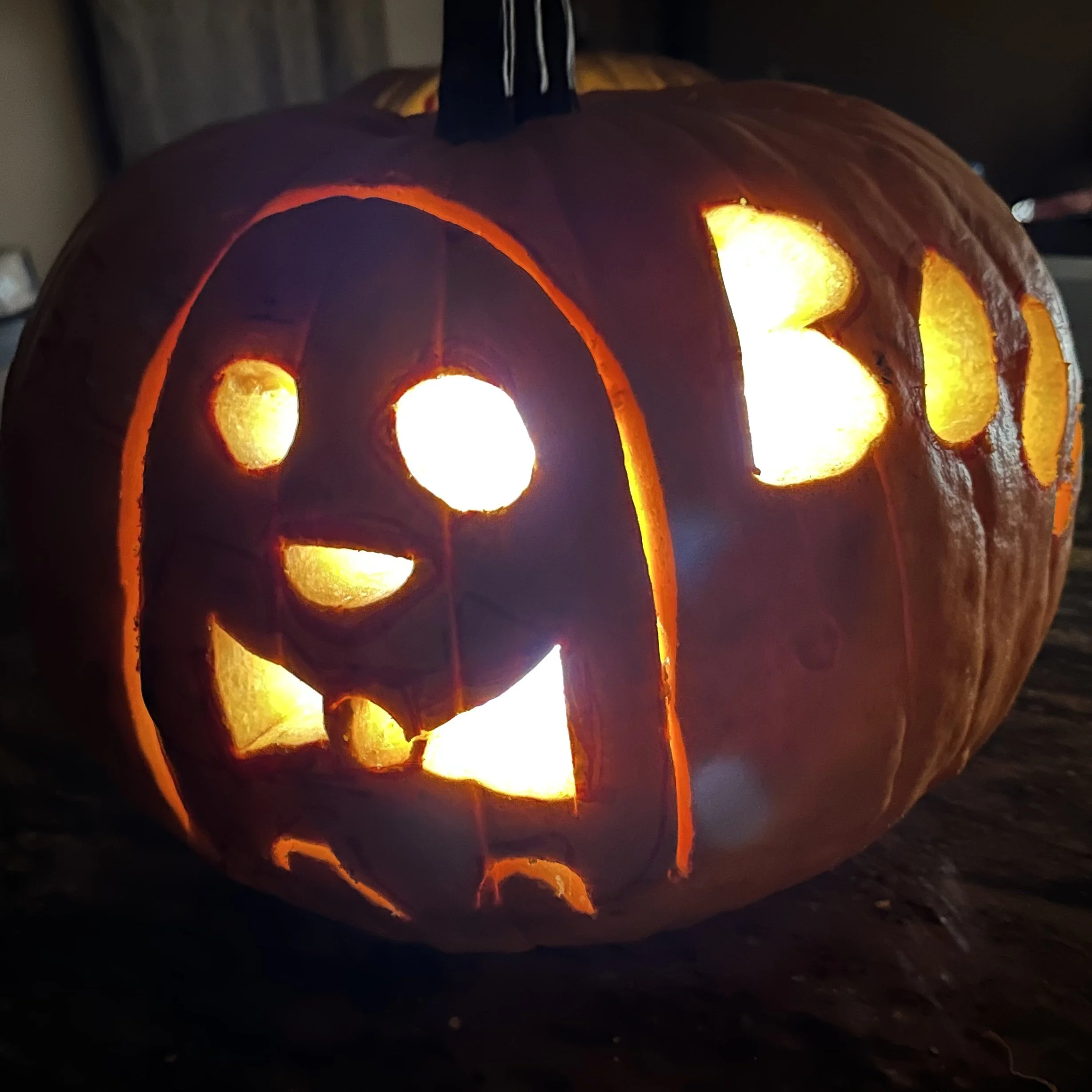 My son was really excited to be part of the process, and wanted to have a Bad Guys pumpkin, so that’s what we did. He also made some additions on the edge of the design which I carved out. I think he liked the idea of hiding spooky things on the pumpkin and wanted to join in on that. The gutting process on these pumpkins is no joke! They are SUPER thick, I’m honestly surprised that the light is able to shine through the uncarved pumpkin skin. Our workbench is on wheels, so we ended up just rolling it outside the garage on the 31st to display for trick or treaters.