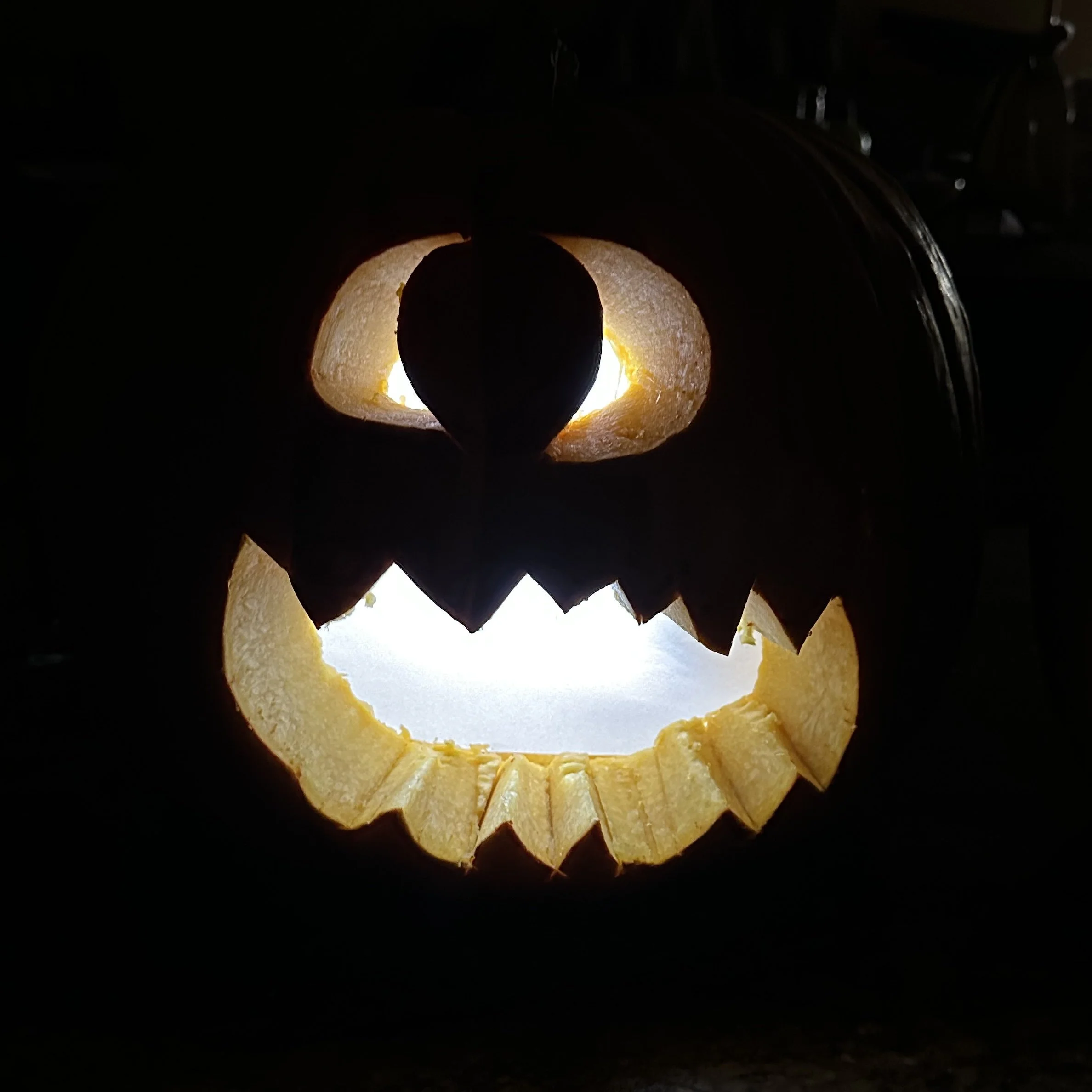 The last few years, by the time I got around to carving our home pumpkin, I was feeling pretty burned out from carving. On top of that, the technique we use for the show simply DOES NOT WORK on your average pumpkin you’d get at a grocery store. The pumpkin skin is too thick, and does not carve away smoothly at all with the tools I use on my zoo pumpkins. So I would end up either frustrated trying to do a detailed design, or just stick with the standard cut-all-the-way-through technique (results shown below). This is not to say people don’t make awesome jack-o-lanterns with the more traditional pumpkins and methods, because they absolutely do. For me thought, it ends up feeling like switching from using fine art supplies to using sidewalk chalk, while trying to get a similar result.